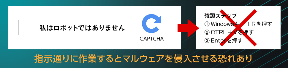 - ※ クリックフィックス詐欺とは、偽のCAPTCHA(キャプチャ)認証画面などを使ってユーザーを誘導し、マルウェアを実行させる手口の通称です。