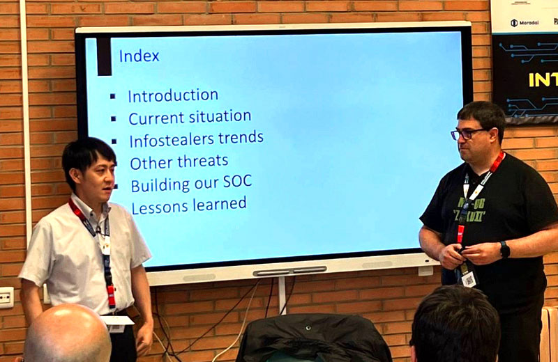 中日である6月19日には、サイバーセキュリティラボの池上がESETスペインのリサーチャー、Josep Albors氏と共同で、「すごく遠くてとても近い。同時に発生した情報窃取マルウェアの攻撃キャンペーンを日本とスペイン間で協力して分析する物語」と題した発表を行いました。この発表では、日本とスペインの間でさまざまな攻撃キャンペーンが同時進行していたことを示し、国を越えた情報連携が重要であることを提言しました。