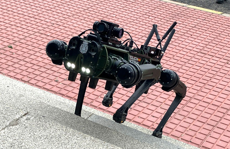 会場である警察学校の入り口には、スペインの歴代のパトカーやヘリが展示されていました。また、会場内のブースでは大きなドローンの展示もありました。犬を模したロボットがデモンストレーションとして会場内を闊歩しており、SF味のある光景には心がくすぐられました。