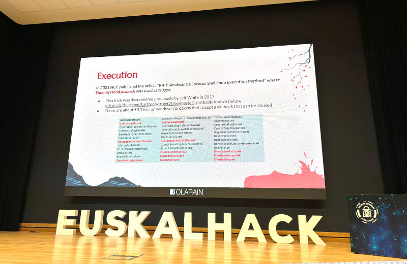 図 6のスライドでは、Lazarusファミリーに属するマルウェアがEnumSystemLocalesA関数を悪用していることを報告する2021年のNCCのレポートが紹介されています。この手法は2017年に既に報告されていたものであることも説明されていました。セキュリティが脆弱な環境に対する既知の手法を用いた攻撃は、日本とスペインの間で共通する課題であるのだと感じました。