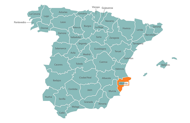 アリカンテの位置を上記の地図にオレンジ色で示しました。アリカンテは地中海に面した港湾都市で、バレンシア地方で州都バレンシアに次ぐ第2位の人口を誇ります。