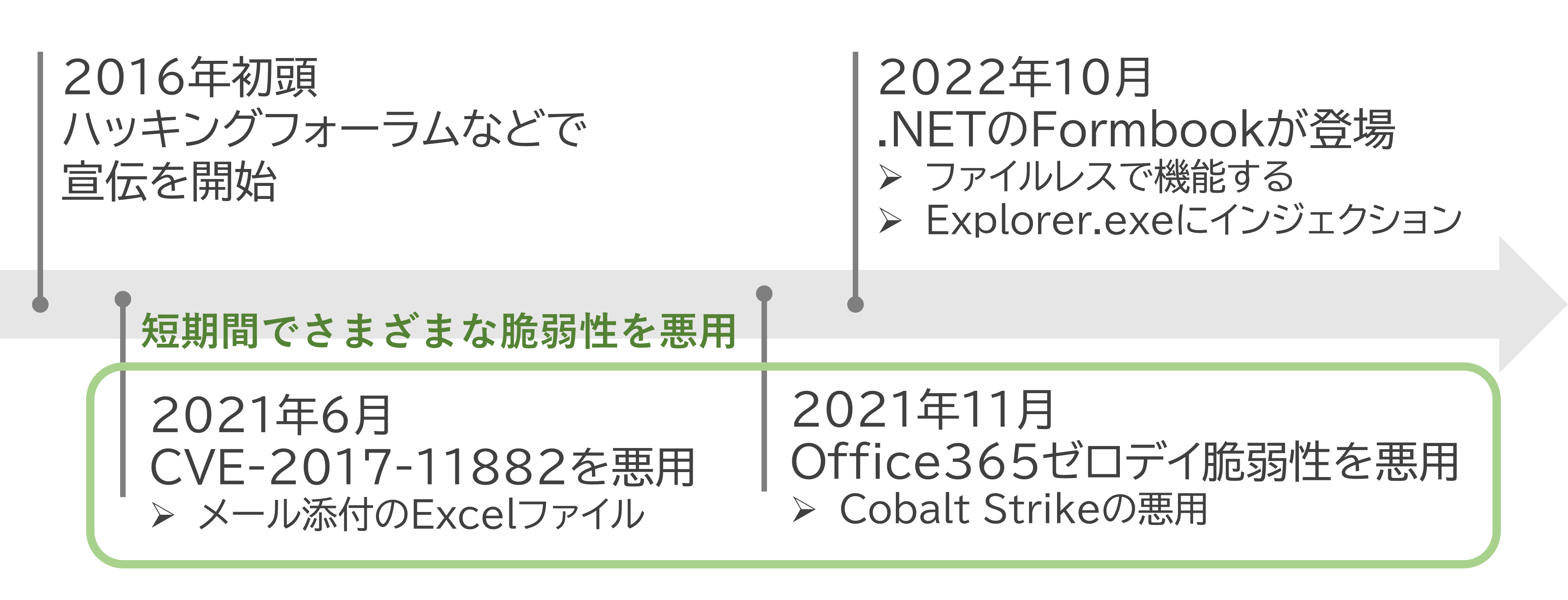 Formbookにはさまざまな脆弱性を悪用する亜種が存在します。下のタイムラインにその一部を記載しました。こうした特徴やRaaSであることから、Formbookの被害数は情報窃取型マルウェア全体でも上位に位置します。