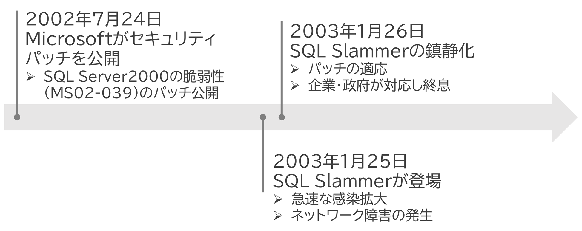 SQL Slammerは、2003年初頭に発見されたワーム型のマルウェアです。その名のとおりMicrosoftのSQL Server 2000またはMSDE 2000に含まれる脆弱性を突くワームです。このマルウェアは爆発的な感染速度で知られており、ネットワーク上で活動を開始してからわずか10分間で、該当する脆弱性を持つコンピューターの90%に感染したともいわれています。