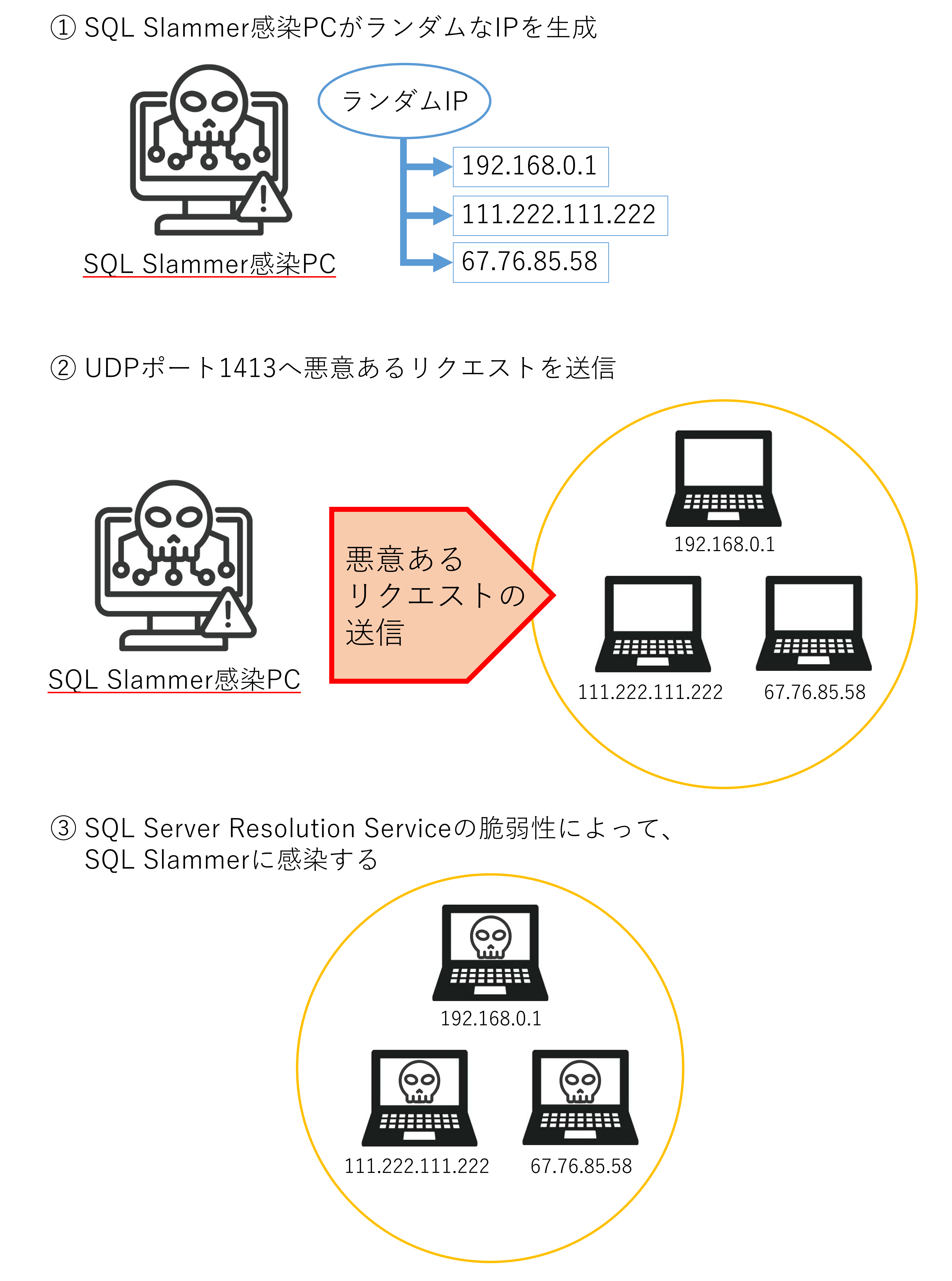 SQL Slammerが行う自己増殖は次の三段階に分けることができます。