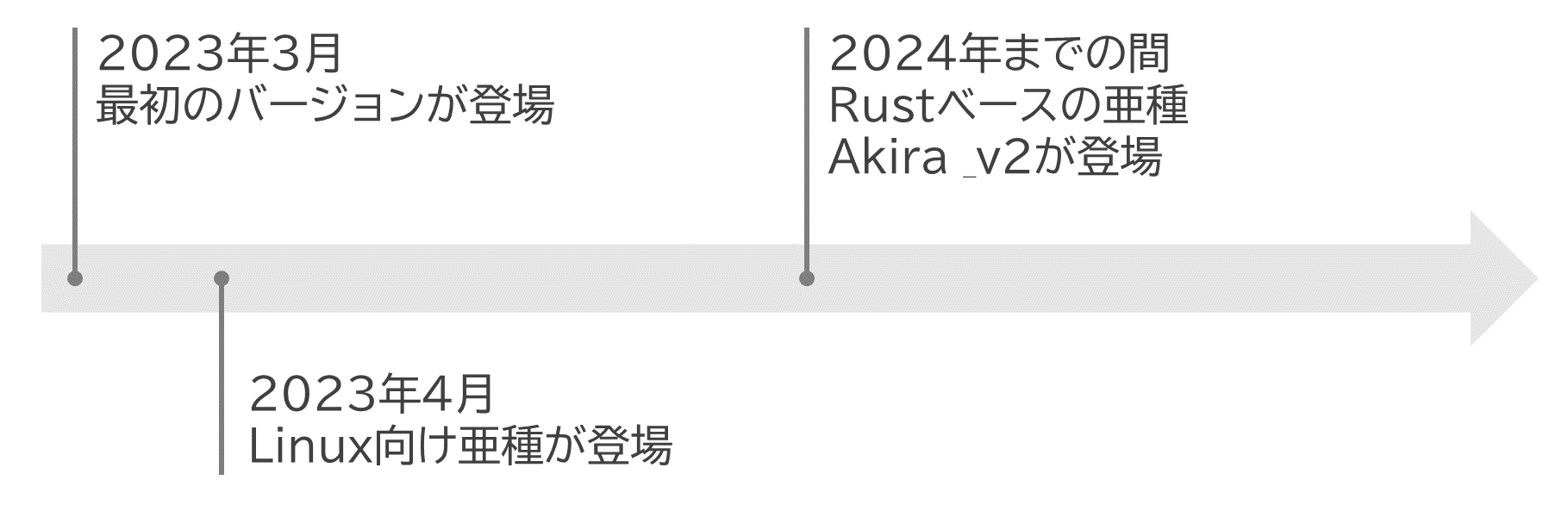 2023年3月に登場し、当初はWindows環境を標的としていましたが、同年4月にはVMware ESXi上のLinux仮想マシンを標的とする亜種も確認されています。また、遅くとも2024年にはRust言語で開発されたAkira _v2の使用が報告されています。