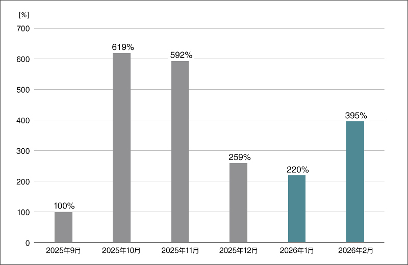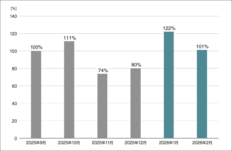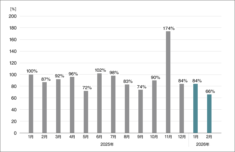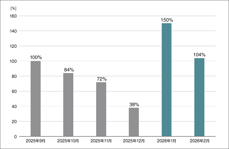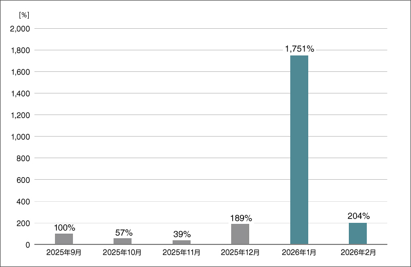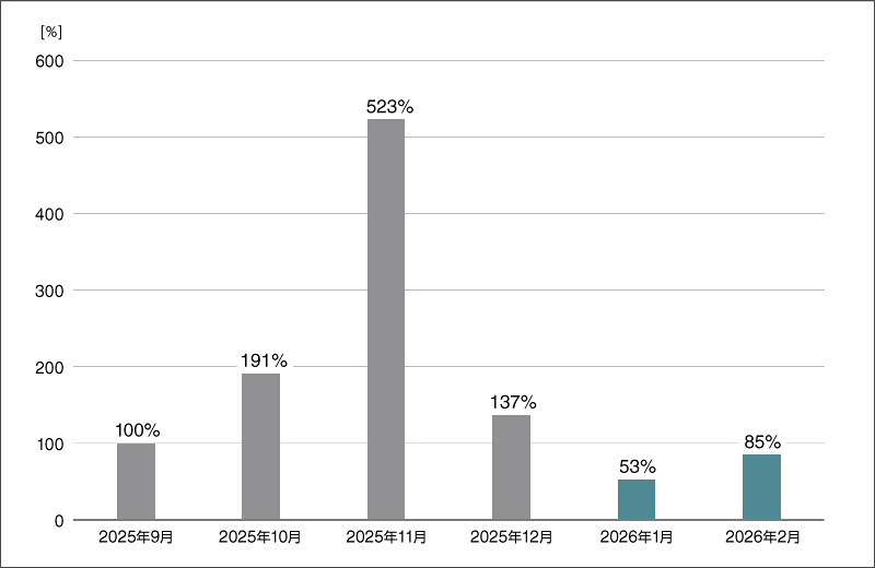 2026年1月(1月1日~1月31日)と2026年2月(2月1日~2月28日)にESET製品が国内で検出したマルウェアの検出数の推移は、以下のとおりです。