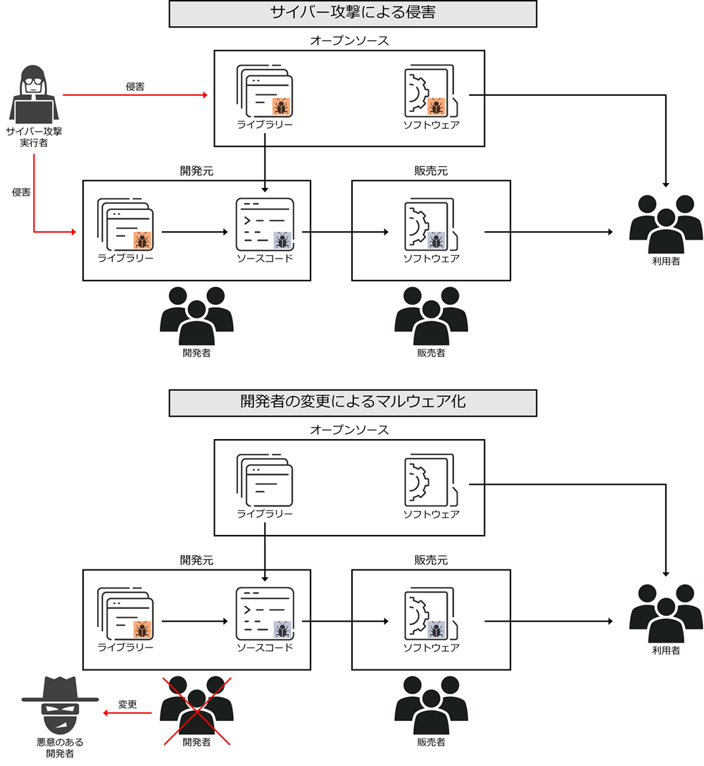 ソフトウェアサプライチェーン攻撃とは、上述のソフトウェアサプライチェーンに対して攻撃者が介入し、悪意のあるコードやマルウェアを混入させる攻撃手法のことです。過去に発生したインシデントを交えながら、攻撃の例を紹介します。