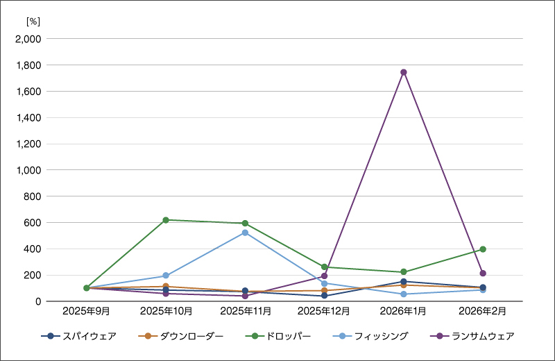 2026年1月はランサムウェアの検出数が大きく増加しました。しかし2026年2月になるとランサムウェアの検出数は減少して平均的な水準に戻りました。また2月はドロッパーの検出数の増加が観測されました。