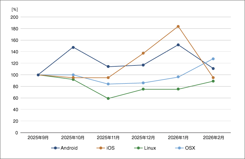 2026年1月は2025年12月と比較すると、Linux以外のOSを標的としたマルウェアの検出数が増加しました。一方で2026年2月になるとAndroidとiOSを狙ったマルウェアの検出数は大きく減少し、Linuxについては増加に転じました。なお、OSXを狙ったマルウェアの検出数については引き続き上昇しています。