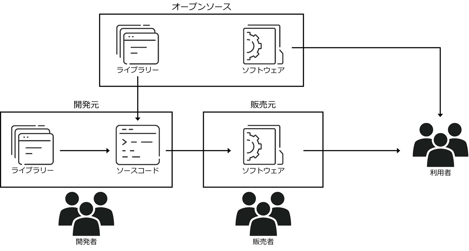 ソフトウェアサプライチェーンとは、ソフトウェアの開発、製造、提供といった一連の工程や、その工程の中で関連するソフトウェアや組織など、ソフトウェアを取り巻く相互関係のことです。ソフトウェアサプライチェーンの簡易的な関係図の例を以下に示します。