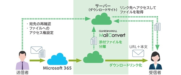 送信者がメールに添付したファイルがサーバーへ自動的にアップロードされる仕組みであり、受信者はメール本文に記載されたリンクからブラウザー経由でファイルをダウンロードする方法となる。