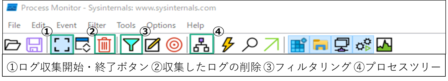 ProcessMonitor起動時に、ログ収集開始ボタンはクリックされた状態です。ログが膨大な量になると分析の作業量も増えるため、調べたい挙動が確認でき次第、ログ収集終了ボタンを押してください。また、ログ収集開始・終了ボタンの左側のボタンでログファイルを保存することができます。