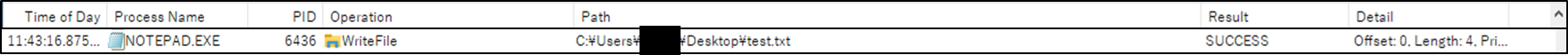 上記ログを見ると、NOTEPAD.EXEというプロセスが、11時43分にデスクトップ上にある「test.txt」というファイルに対して「WriteFile(ファイルへの書き込み動作)」を行ったことが読み取れます。