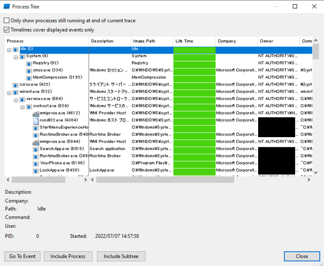 プロセスを時系列ごとにツリーを表示する機能です。直近で実行されたプロセスは、下に追加されています。プロセスツリー内の「Life Time」は、プロセスが起動していた時間を緑色のバーで表示しています。プロセスが終了すると、緑色のバーも途切れます。