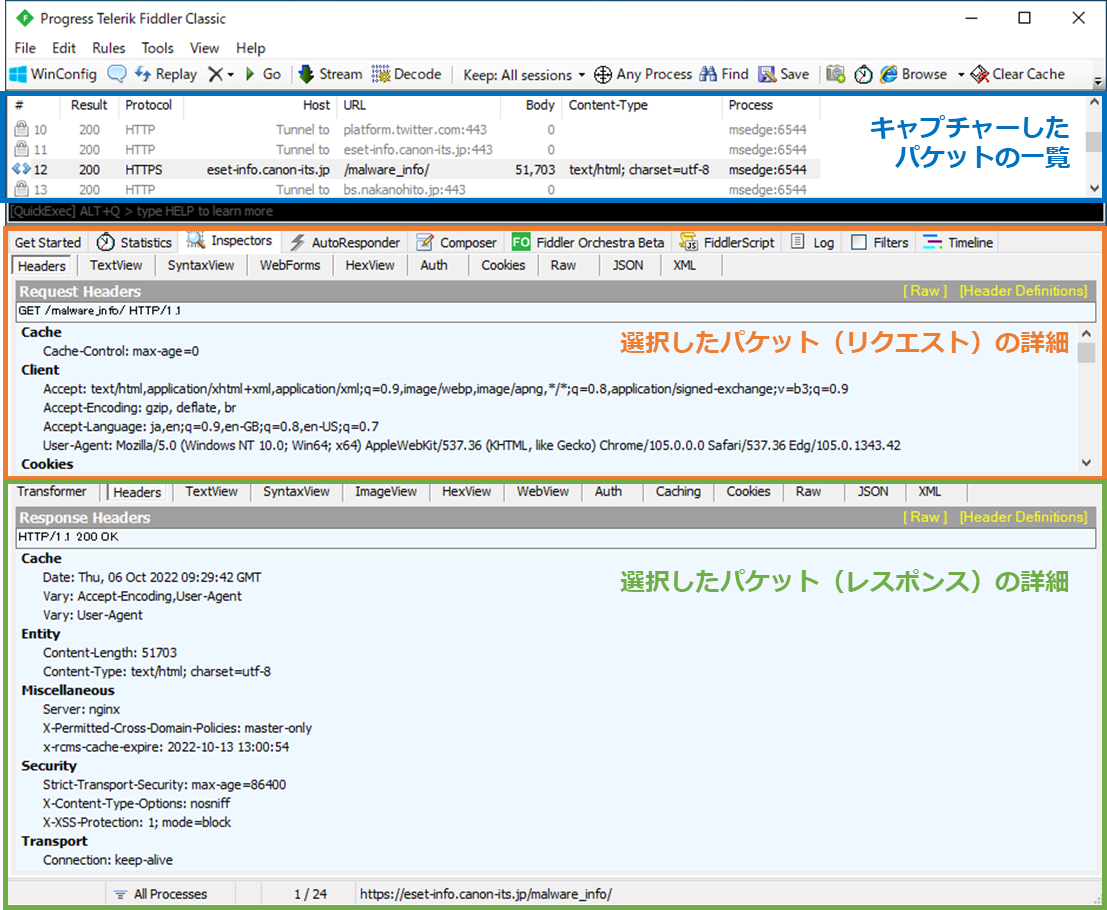 下図は、本サイトであるサイバーセキュリティ情報局(https://eset-info.canon-its.jp/malware_info/)にアクセスした通信をFiddlerでキャプチャーした画面です。青枠にキャプチャーしたパケットの一覧が表示されており、選択するとその通信の詳細がオレンジ枠と緑枠に表示されます。