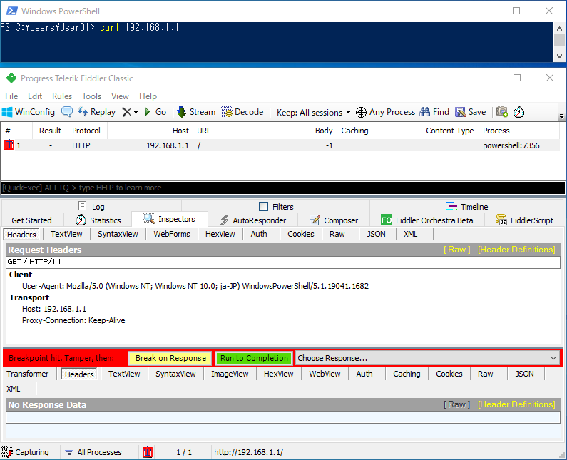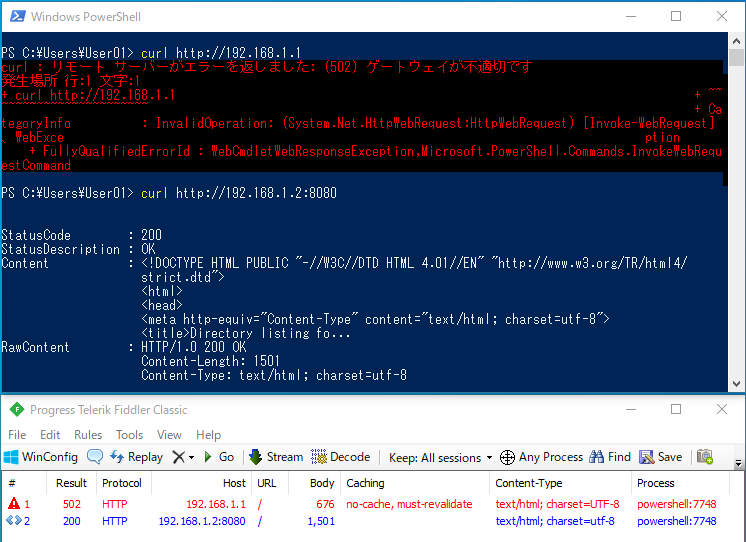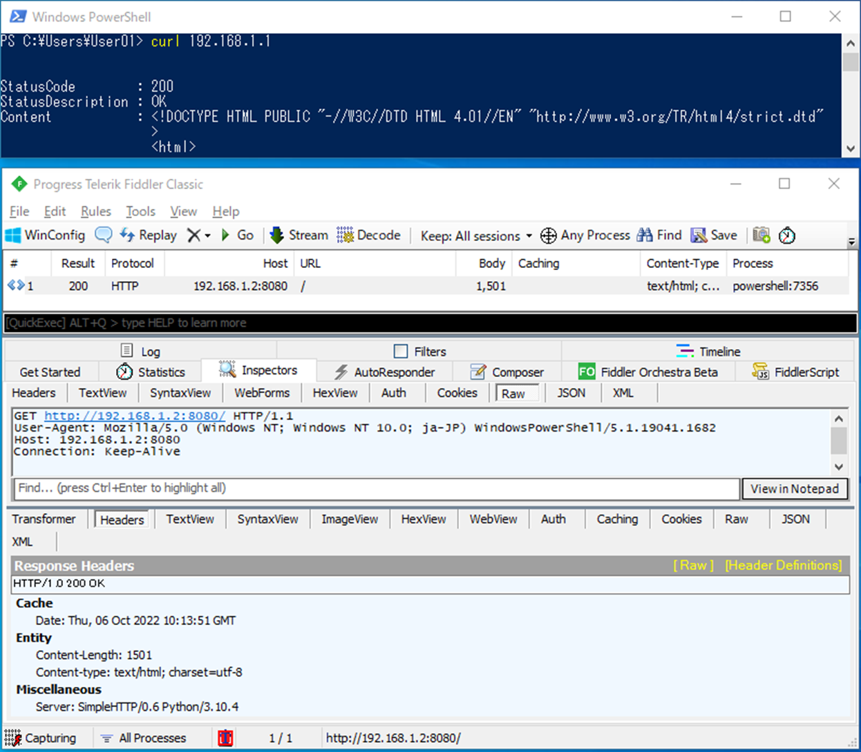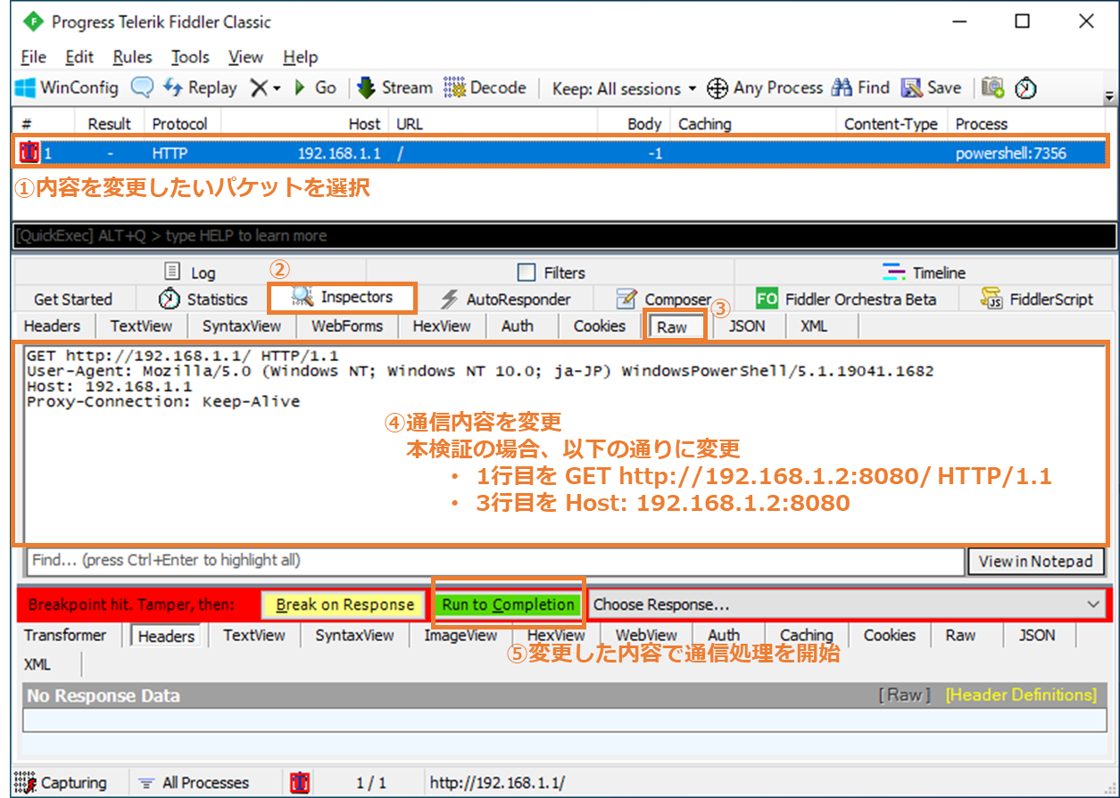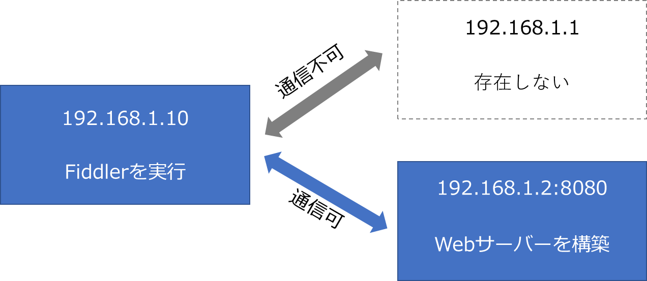 以下では、192.168.1.1へのHTTP通信を、Fiddlerを用いて192.168.1.2:8080へ変更する様子を紹介します。