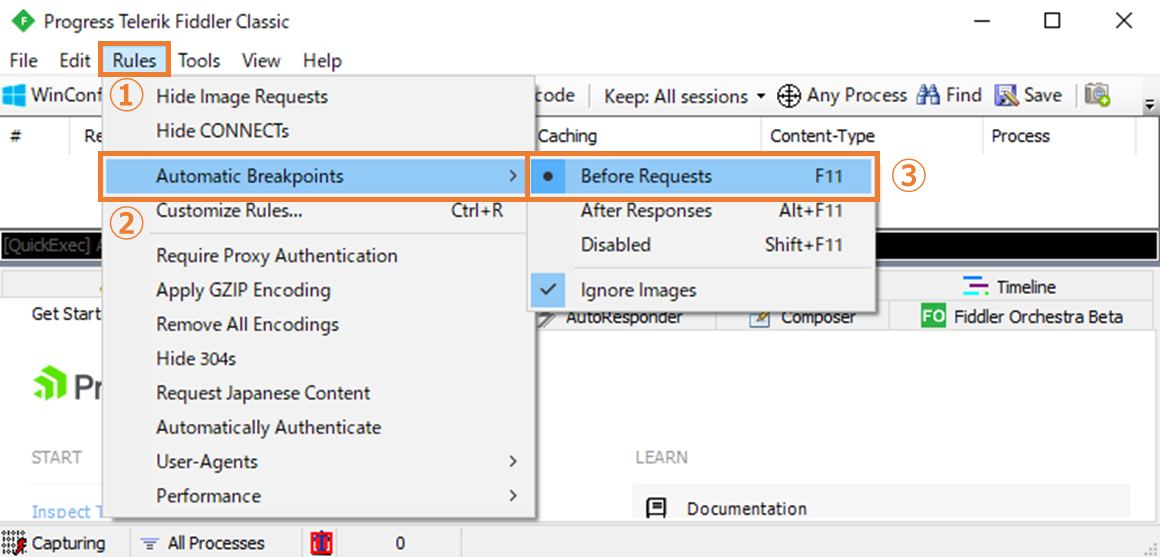 キャプチャーした全通信に対して、リクエストが処理される前にブレークポイントが設置されるモードにします。