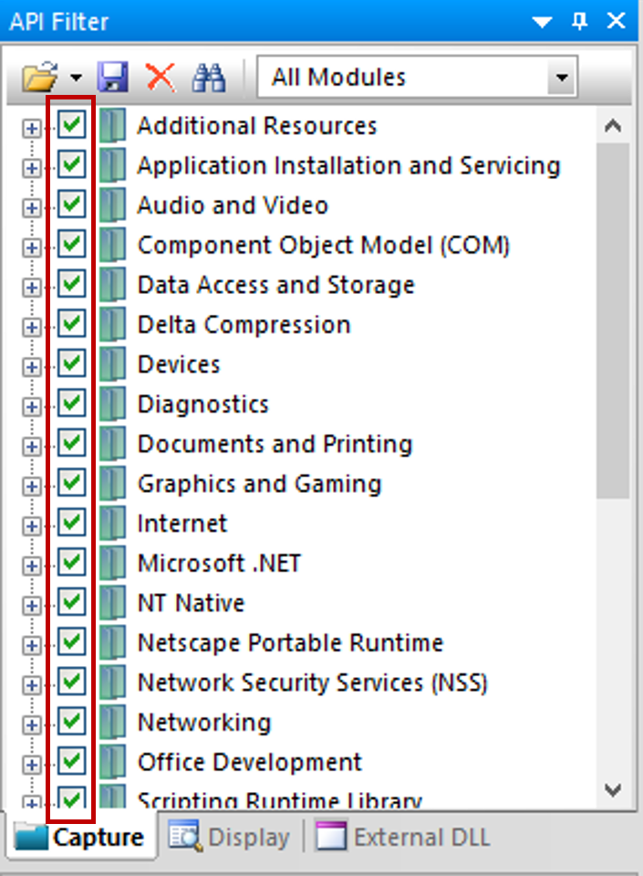 監視するAPIの項目にチェックを入れます。マルウェアによって呼び出されることの多いAPIや調査したい動作に関係するAPIなど、項目を絞り込むことで効率的な解析を行うことができます。