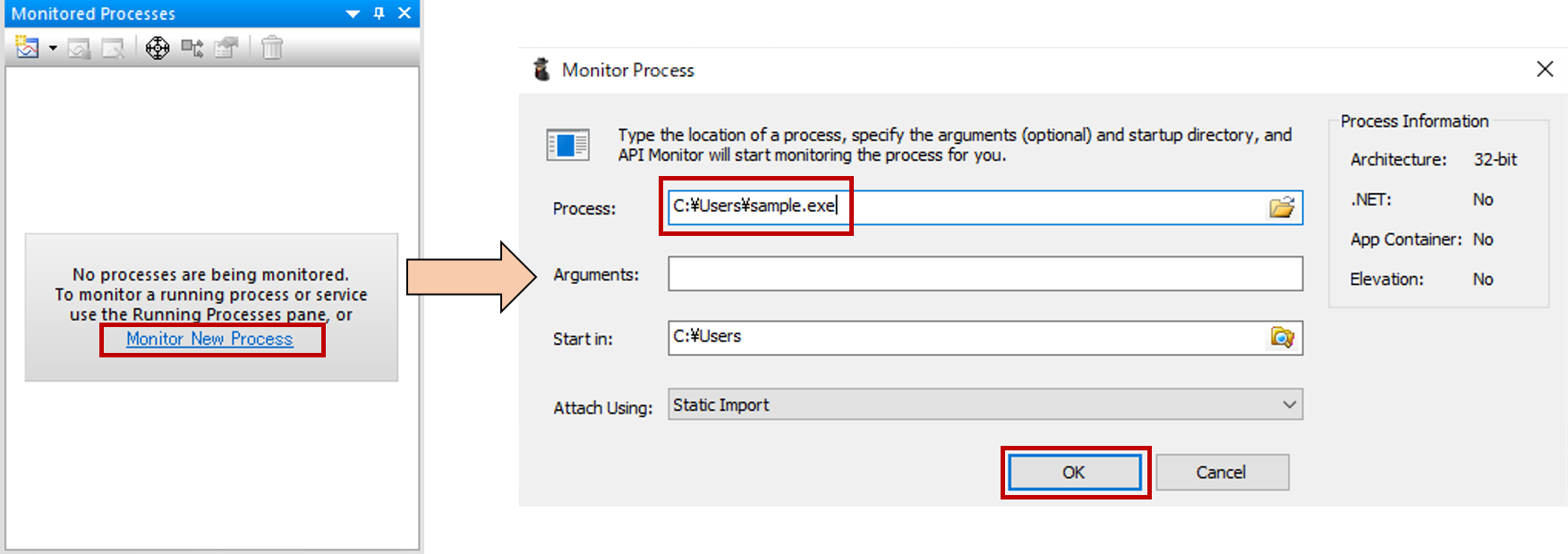 マルウェア解析の分野では、API MonitorはAPIを利用した処理(ハードウェア情報の取得、データの暗号化や復号、解析妨害など)の解明に利用されます。今回はマルウェア(ファイル名:sample.exe)がプロセスインジェクションを行う処理について紹介します。