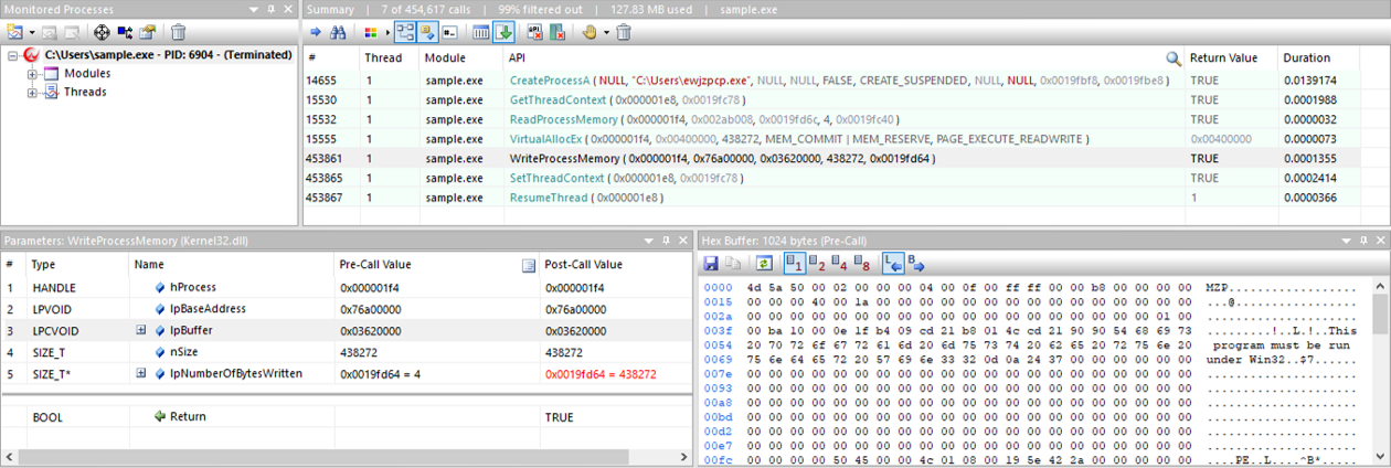 キャプチャされたAPI情報を確認することで、マルウェアの挙動を把握することができます。下図を見ると、読み込んだsample.exeによって以下のAPIが呼び出されたことが確認できます。これらのAPIから、sample.exeがプロセスインジェクションの手法を備えた検体であることが分かります。
