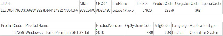 悪用されたsetupSNK.exeのSHA1ハッシュ値(EE7D06FC93D3C608B48823D1444148327330015A)をNSRLで確認すると、次の画像にある情報が得られます。NSRLには、ハッシュ値やファイル名以外にOS情報なども存在します。これを利用することで、SHA1ハッシュ値からsetupSNK.exeがWindows 7の古いOSのものであることが確認できます。本来の環境から逸脱した実行ファイルが存在した場合は、攻撃者による痕跡である可能性があります。
