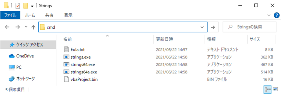 stringsのあるフォルダーでアドレスバーに「cmd」と入力してコマンドプロンプトを実行します。もしくは環境変数のPATHにStringsフォルダーを追加し、任意の場所で実行します。