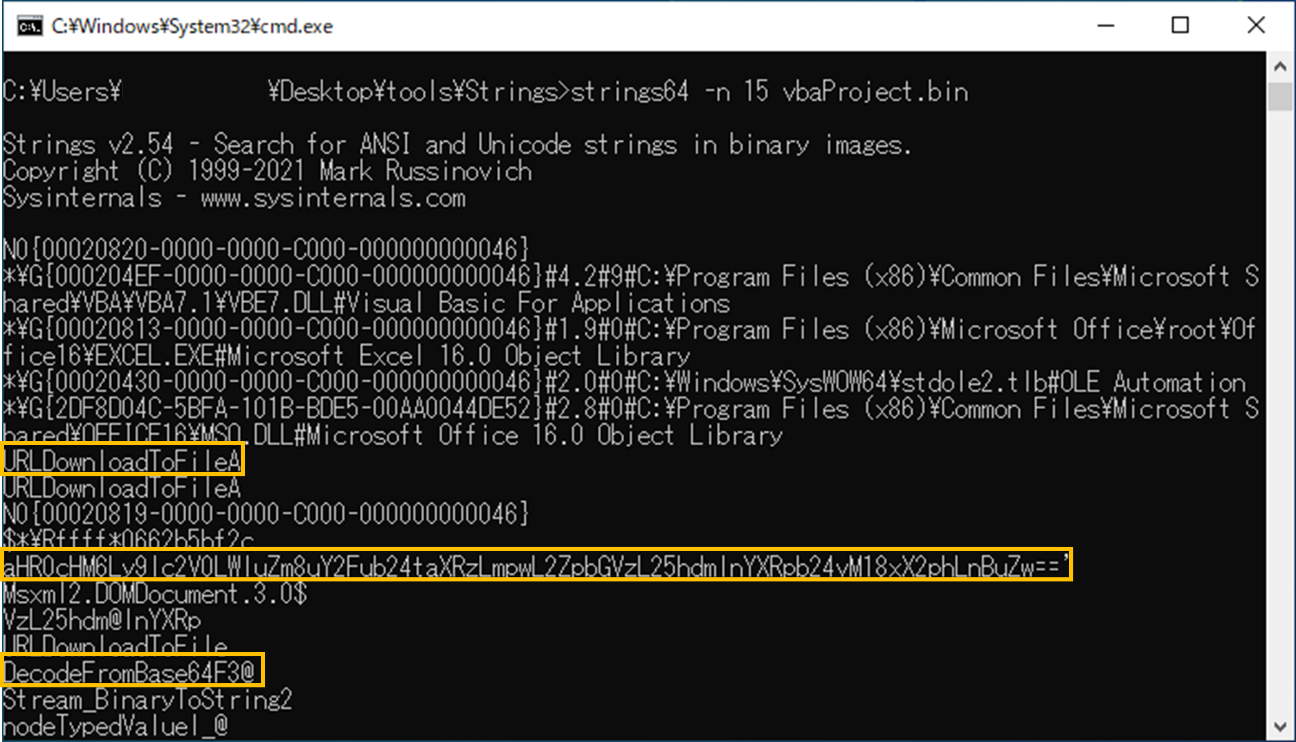 パラメータに「-n 15」を設定し、vbaProject.bin に対してStringsを実行します。短い文字列の中には意味を持たないものも多く含まれるため、はじめは文字長を長めに指定して調べることを推奨します。