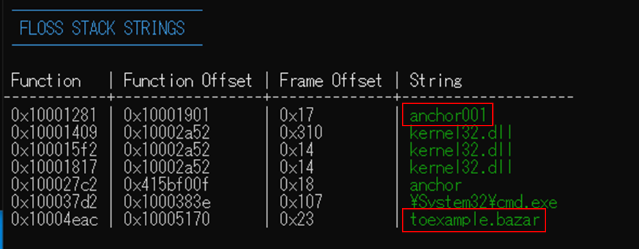 「anchor001」を調べると、Anchorによって生成されるグローバル一意識別子に含まれる文字列ということがわかります*1。「toexample[.]bazar」を調べると、マルウェア「BazarLoader」の配布に使われているbazarドメインの通信先の一部だとわかります。このことから、マルウェアがBazzarLoaderに関係している可能性が考えられます。このほかにも、関数と思われる抽出文字列から機能を推定することも可能です。