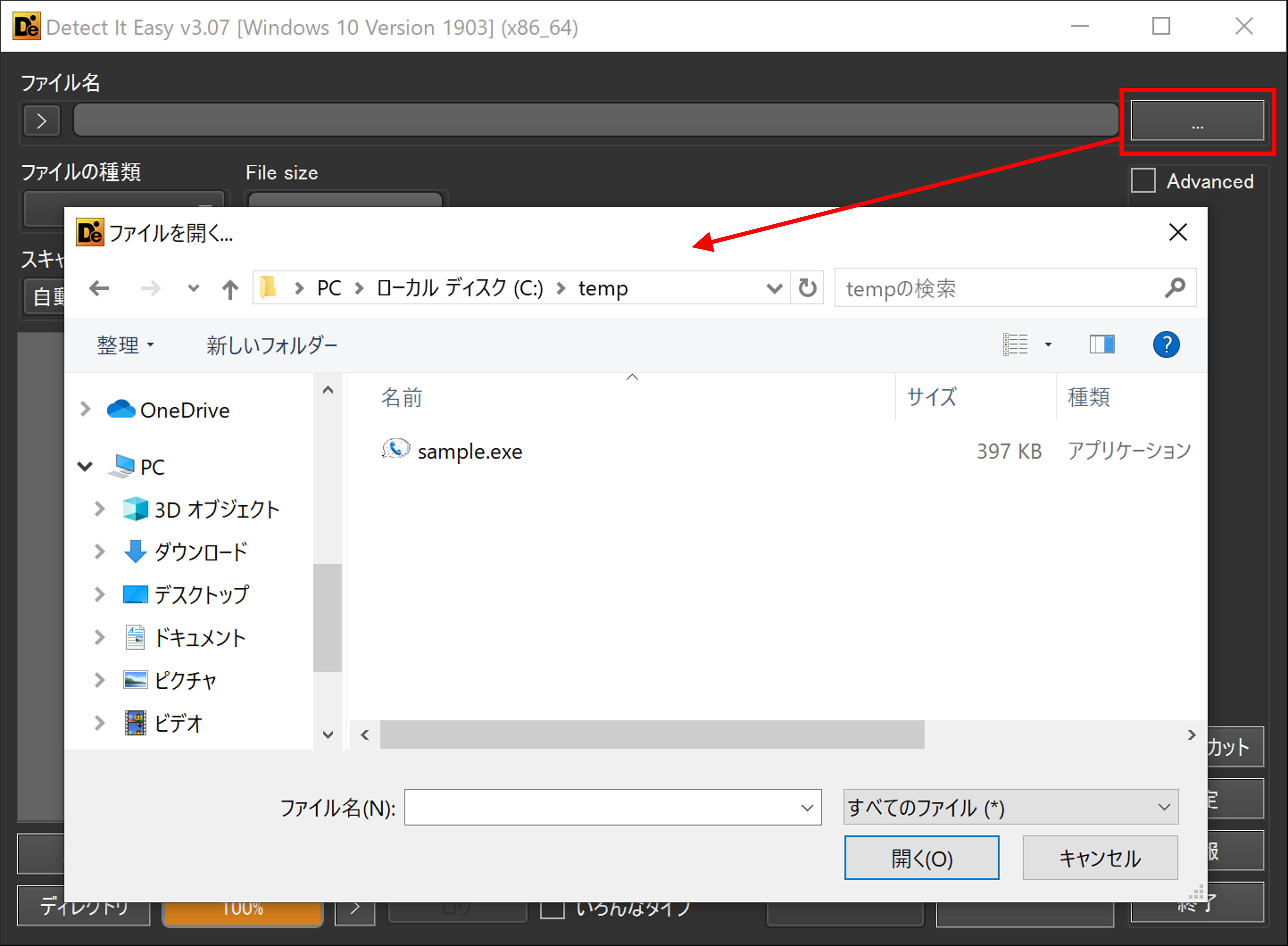 ファイルダイアログあるいはドラッグ&ドロップにより、解析対象の検体をDetect It Easyに読み込ませます。