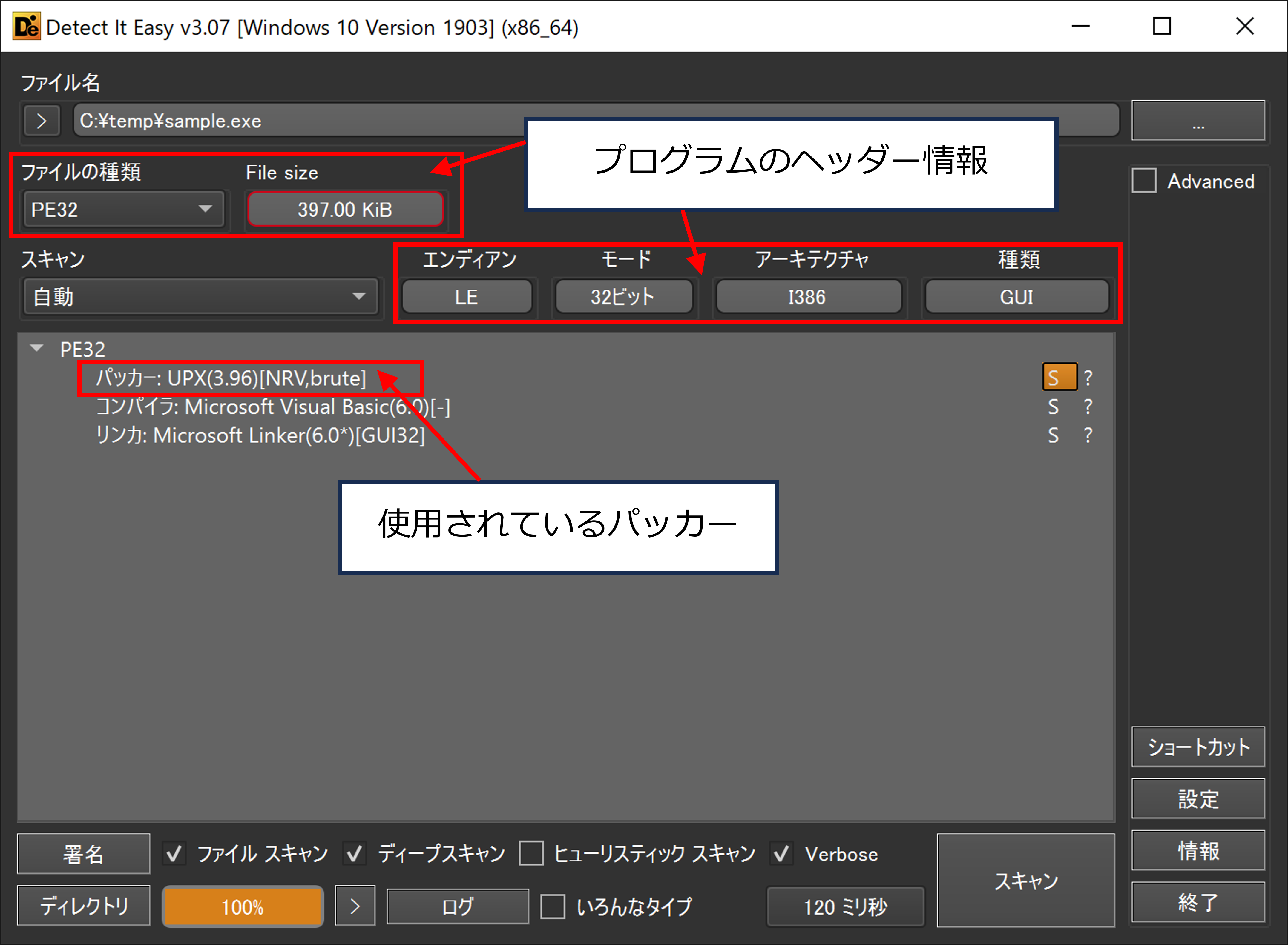 検体を読み込ませると、デフォルトの設定では自動でプログラムの解析が行われます。解析結果を確認すると、図の検体の場合は32ビットのWindows実行形式ファイルであることやパッカーとしてUPXのバージョン3.96が使用されていることなどが分かります。