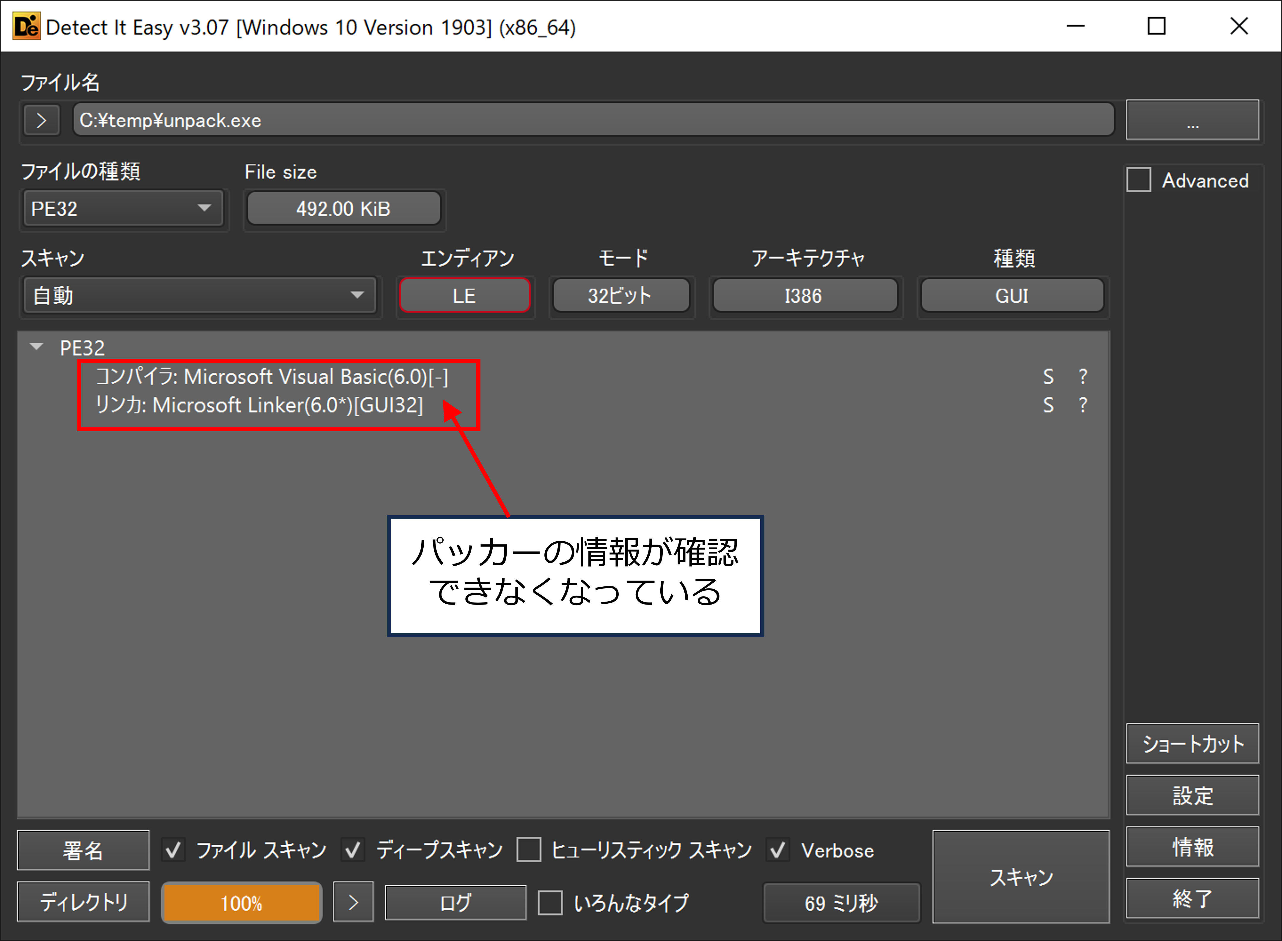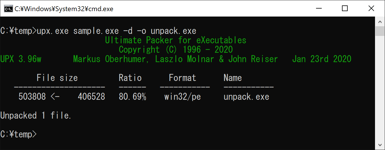 アンパック機能を備えたパッカーも存在しますが、その機能が無い場合はアンパックが可能な別のツールを探す必要があります。今回の検体で使用されたUPXにはアンパック機能が備わっているため、そのままUPXを使ってアンパックすることが可能です。以下の図ではアンパックした検体をunpack.exeとして出力しています。