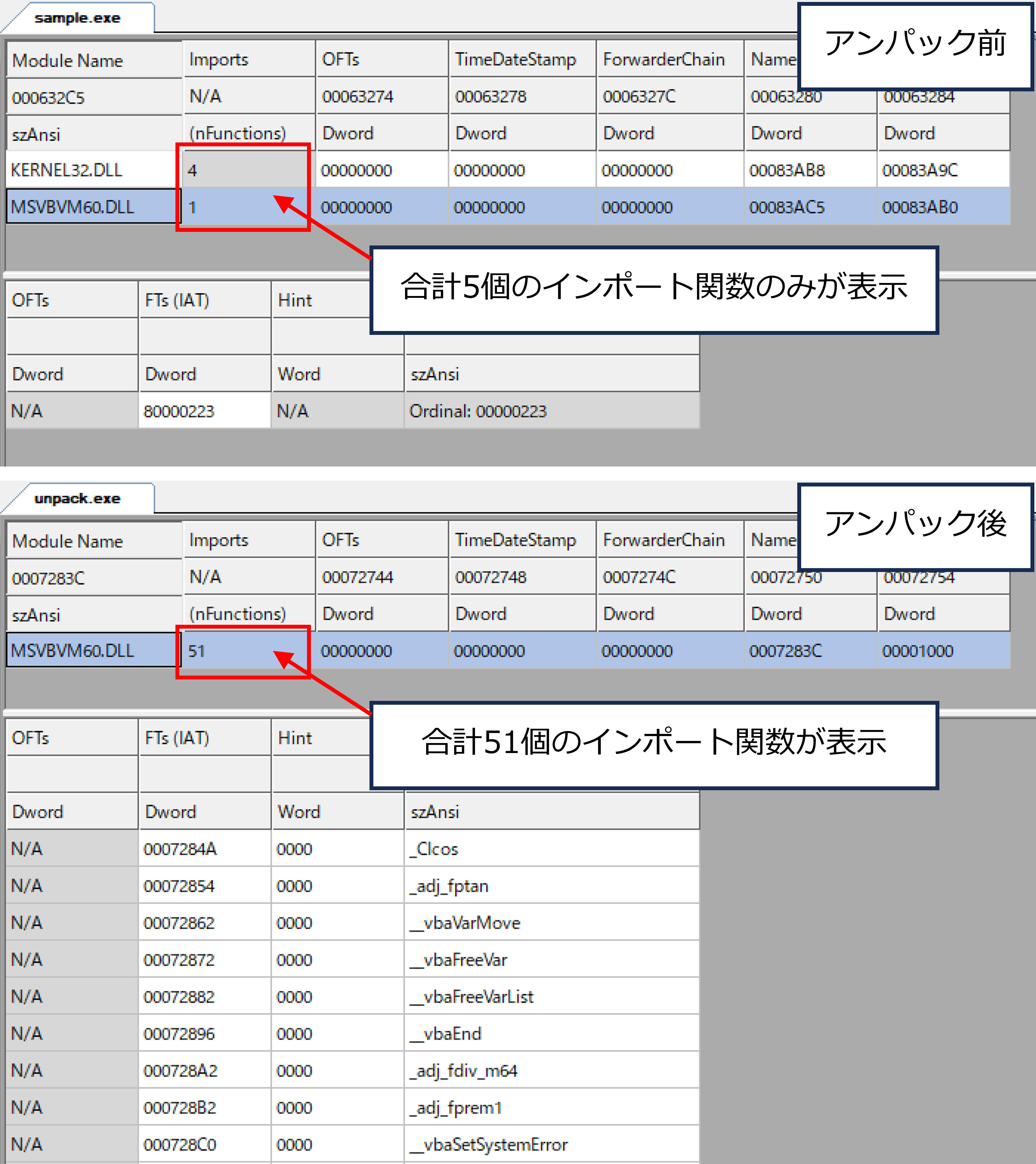 プログラムをアンパックすることでバイナリの難読化が解除されるため、主にマルウェアの表層解析や静的解析でより多くの情報を得ることができるようになります。例として、今回の検体に動的リンクされたインポート関数の比較を以下に示します。