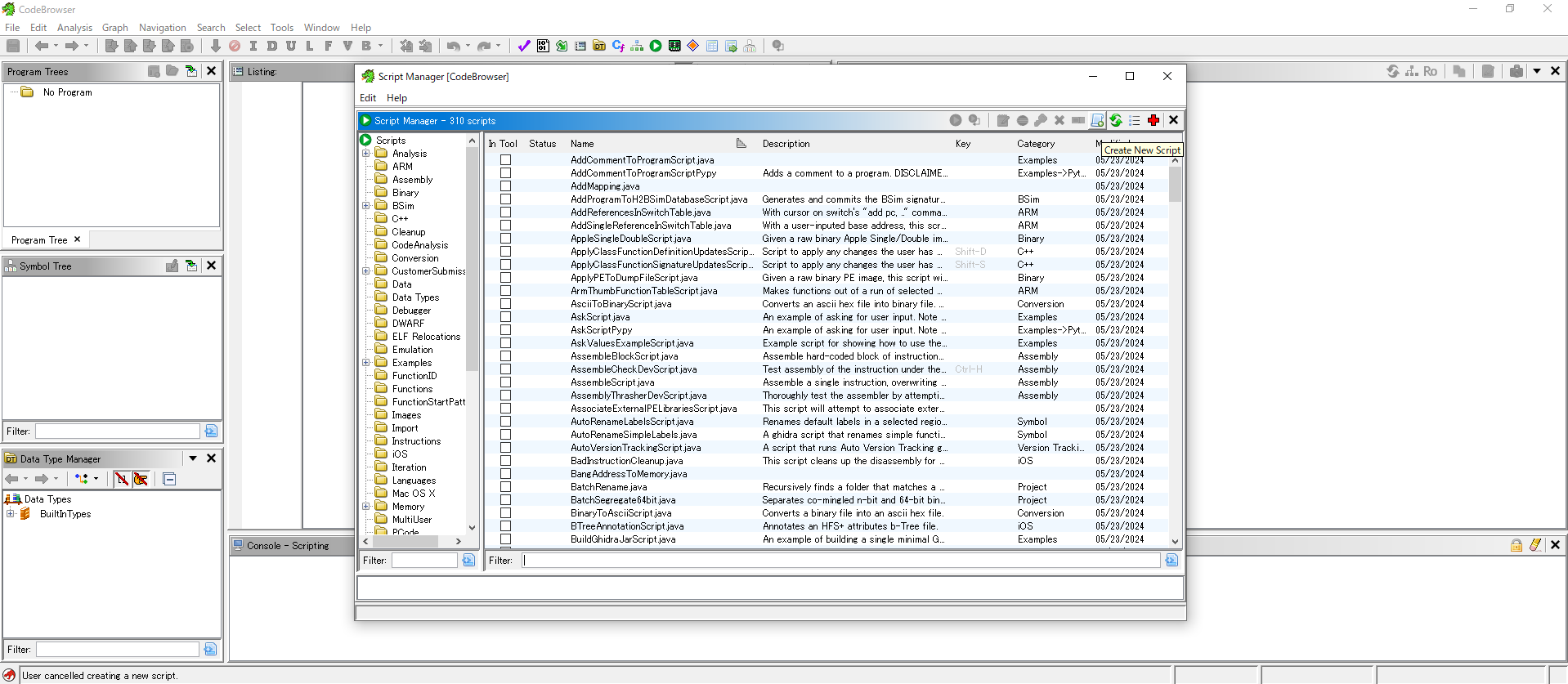 ①GhidraのScript Managerを開き、「Create New Script」->「Python」を選択し、スクリプト名を入力