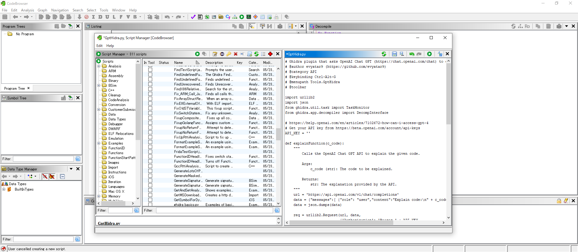 GptHidra は、リバースエンジニアリングソフトウェアであるGhidraのプラグインです。デコンパイルした関数の説明をOpenAI社のChatGPTに問い合わせることが可能です。