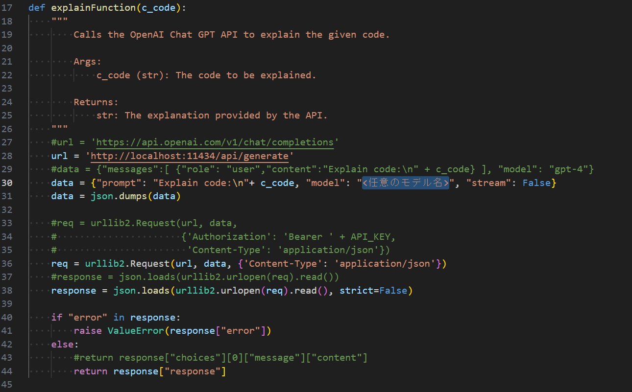 Ollamaサーバーに接続させるため、通信先やリクエスト、レスポンス部分のコードを一部書き換えます。主要な部分のみ変更したコード例を以下に示します。モデル部分には、Ollamaで利用可能な任意のモデルを選択し保存します。