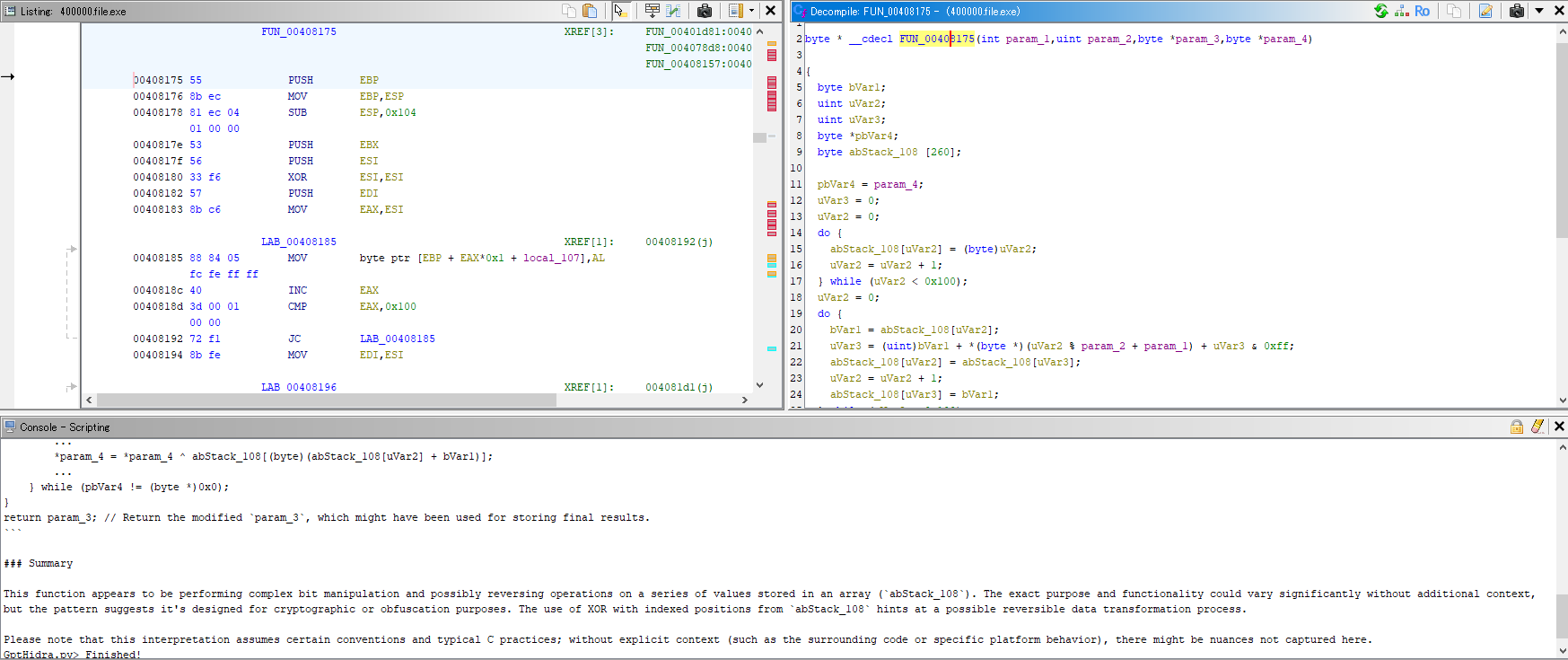 説明を表示したい関数を選択し、GptHidraを実行します。関数の説明はGhidraコンソール上に表示されます。[Tools]のメニューや[@keybinding]で設定されているショートカットキー(Ctrl + Alt + G)による実行も可能です。