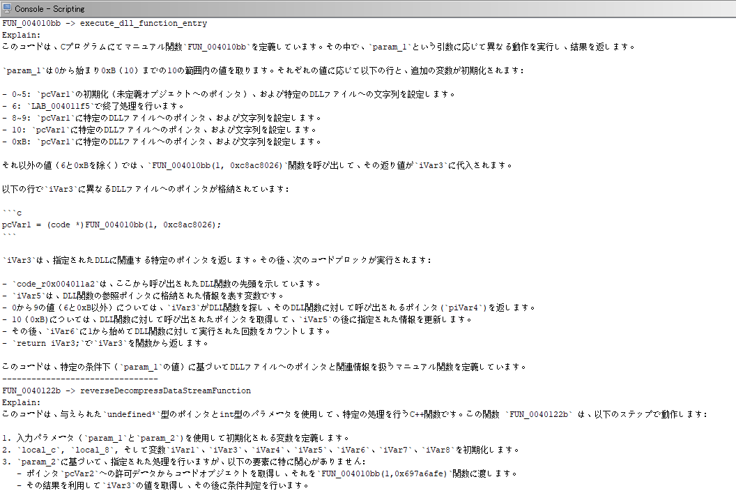 以下は、すべての関数に対して関数名と簡単な説明をリクエストした例です。事前にまとめて処理しておくことで、解析に役立つ情報が得られる可能性があります。