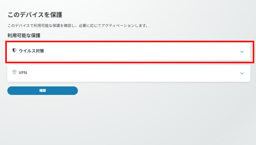 VPN機能がご利用いただける製品の場合、以下のような保護の選択画面が表示されますので、「ウイルス対策」を選択してください。